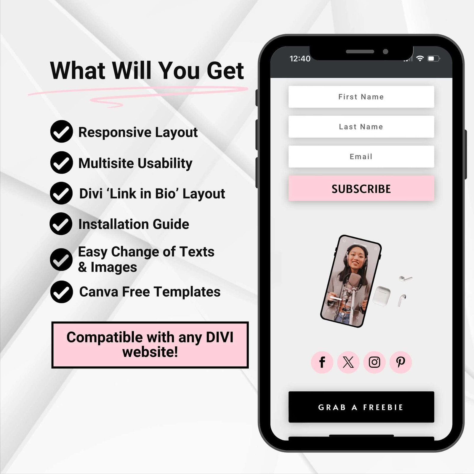 Easily organize all your important links in one place with this sleek and modern Link in Bio for Creators! Create a new page on your Divi website, apply the layout, update the text, images, and URLs, and you’re ready to share it across your social media platforms. This package includes all images featured in the ‘Link in Bio’ as a Canva Free Template, allowing you to effortlessly swap out photos, and fully customize it to your liking. /*Compatible with Any Divi WordPress Website*/*Canva Free Templates Included*/